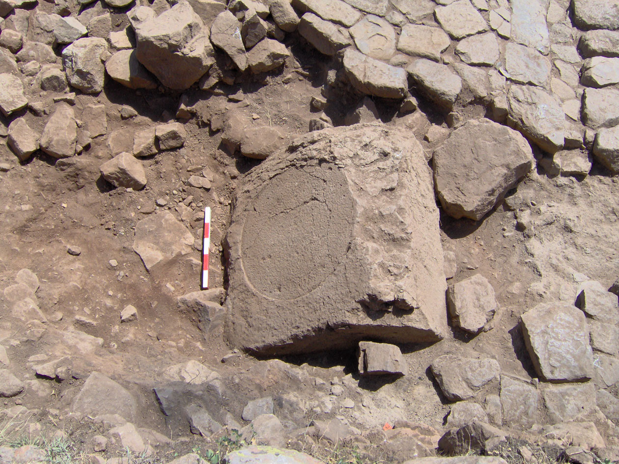 - A square column base with a circular recess for a wooden column was found tilted into a robber pit. - Ahşap bir sütun yerleştimek amacıyla biçimlendirilmiş kare biçimli sütun altlığı bir tahribat çukuruna doğru eğilmiş bir biçimde bulunmuştur.