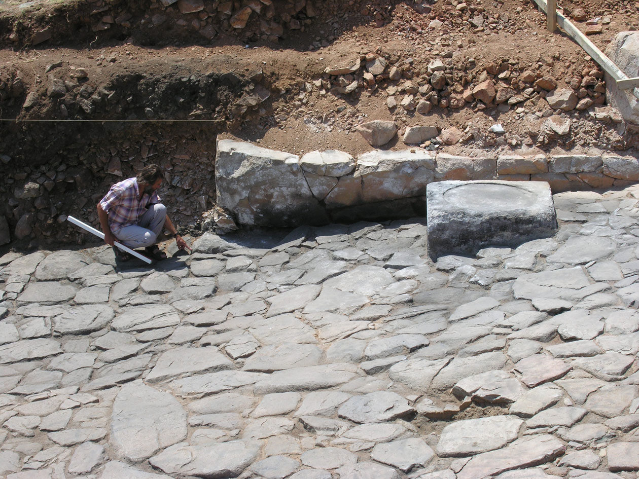 ayağının köşesindeki çıkmayı işaret ediyor. Kumtaşı sütun tabanında çapı