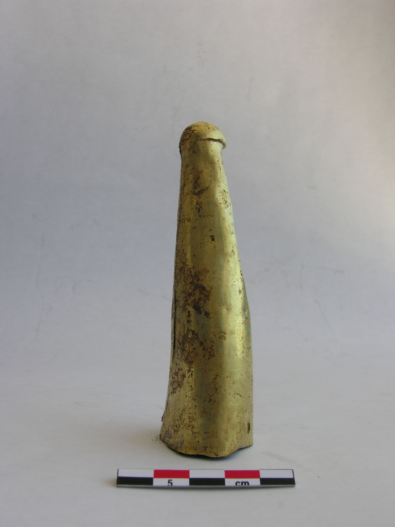 - Horn, gold sheet, K05.215 with ID 05TR16U16met05, hollow with traces of wood surviving. - Boynuz, altın levha, K05.215 ve ID 05TR16U16met05, iç boşluğunda tahta izleri bulunmaktadır.