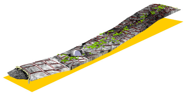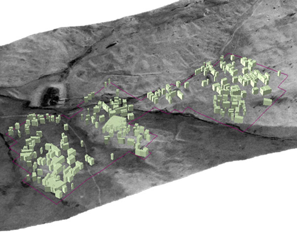 - 3D models with buildings shown as green blocks and compound walls marked out. - Yapıları yeşil renkli bloklar halinde gösteren, yapı adası duvarları işaretlenmiş üç-boyutlu modeller.